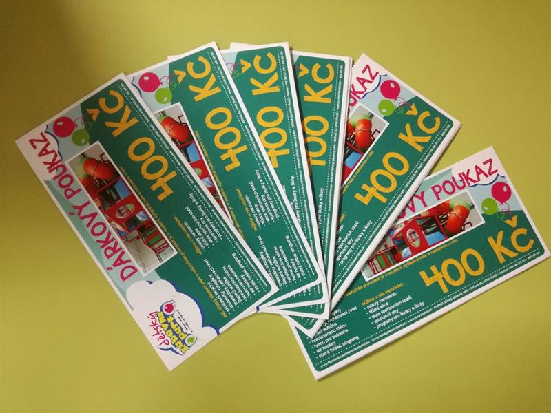 Připravili jsme pro vás nově barevné dárkové poukazy s novou grafikou a můžete si vybrat z poukazů v hodnotě 100,200 a 400,-Kč. Poukazy je možné využít na úhradu běžného vstupného nebo také na úhradu nájmu v případě konání dětského párty nebo oslavy narozenin mimo běžnou pracovní dobu.